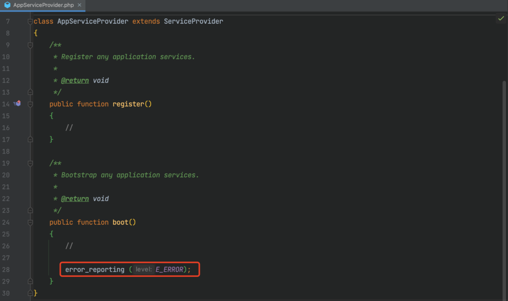 app/Providers/AppServiceProvider.php代码文件中 boot 方法里面添加 error_reporting (E_ERROR);