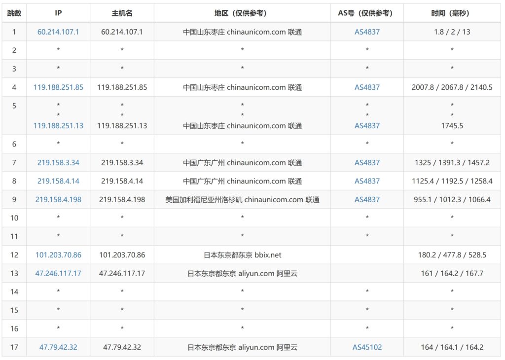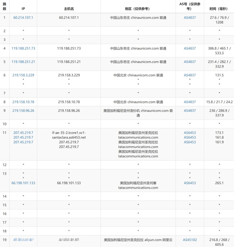 我是用的联通的宽带,可以看到去程是走的联通AS4837的骨干网,到美国落地。可以看到落地地区,果然是阿里云机房😂,不知道有没有什么内幕。