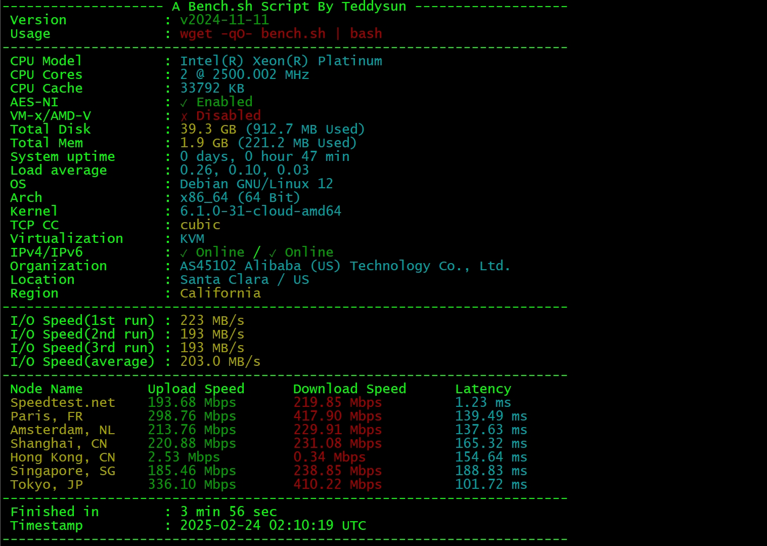 测完了线路,下面在机器内跑一下测评脚本看下情况,我使用的是Bench.sh的测试脚本,执行代码wget -qO- bench.sh | bash,下面看下结果: