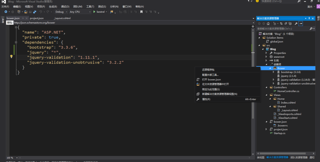 VS 2015使用bower管理前端包,很好很强大 作者: 吴杰 分类: 编程 发布时间: 2015-11-30 19:00 VS 2015使用bower管理前端包,很好很强大。 主要是配置bower.json,如下图: bowervs
